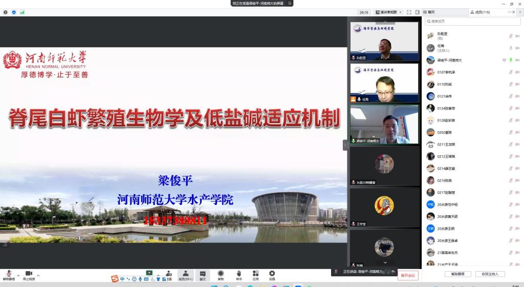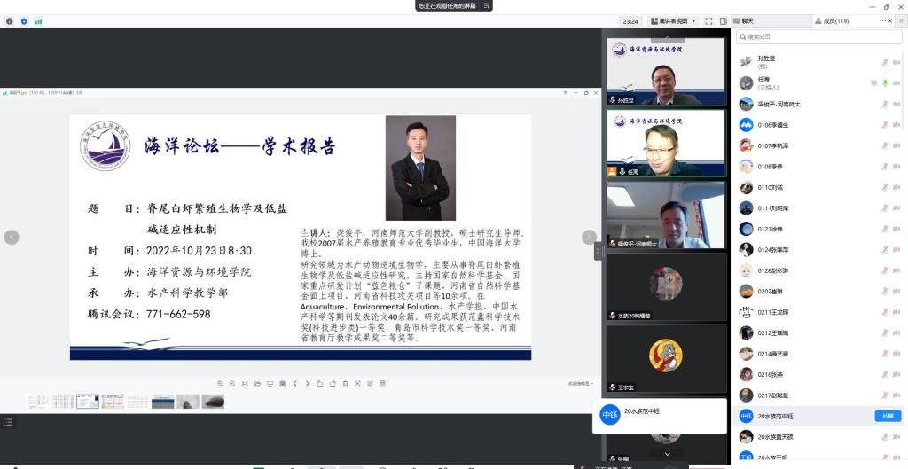 2022年10月23日上午,BB贝博艾弗森原官方网站三期海洋论坛活动在腾讯会议线上进行,本次活动邀请了优秀校友河南师范大学梁俊平博士给我院师生做学术报告。会议由水产科学教学部任海博士主持,水产科学教学部全体教师、渔业发展硕士研究生以及贝博官网本科生300余人收听了报告,学院党委副书记、副院长孙胜显出席会议。