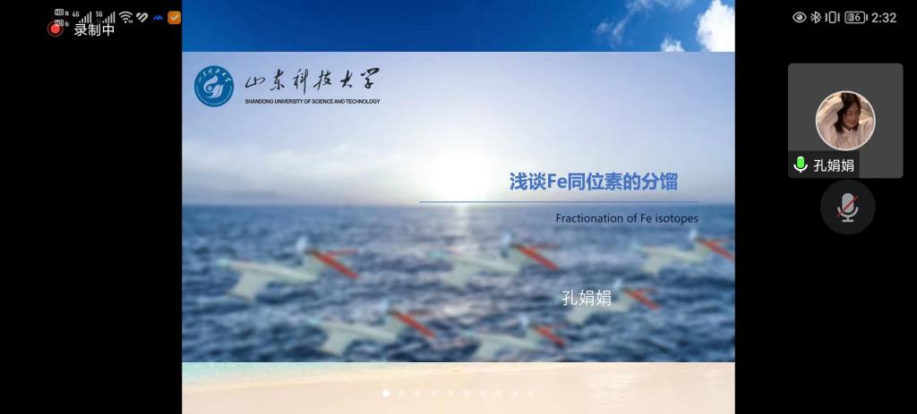 2022年11月6日下午,BB贝博艾弗森原官方网站第四期海洋论坛活动在线上举行,本次活动邀请来自山东科技大学孔娟娟博士为我院师生做了题为《浅谈Fe同位素分馏》的学术报告。会议由海洋生物资源教学部马瑶博士主持,学院党委副书记、副院长孙胜显出席会议。参会成员为海洋资源与环境专业全体师生。